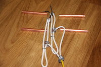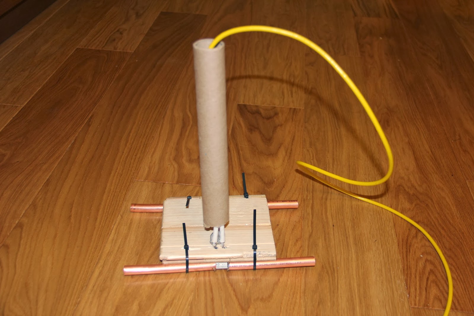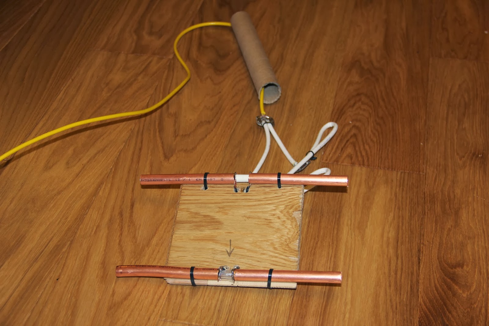 По приборам всё получается, но хочется убедиться, как реально будет работать антенна. Я не удержался и сделал её макет на участок дециметрового диапазона телевизионного вещания, учитывая тот факт, что симметрирующе-согласующие звенья вполне соизмеримы с антенной на этой частоте. Чтобы не рекламировать пиво в баночках, заменил их медной трубкой, приобретённой на строительном рынке (медь обладает лучшей электропроводностью, идеальный материал после золота). Диаметр трубки 1,2 см, отрезанного метра хватит на целых две антенны, а это целых восемь баночек, одному не управиться их освобождать, здесь помощник нужен. Не буду говорить, какой телевизионный канал взял за среднюю частоту расчёта, напомню, что антенна не широкополосная, но основной размер минимального элемента у меня равен 11 см, это длина элемента диполя, расстояние между ними, длина звена U-колена и отрезок кабеля сложения.