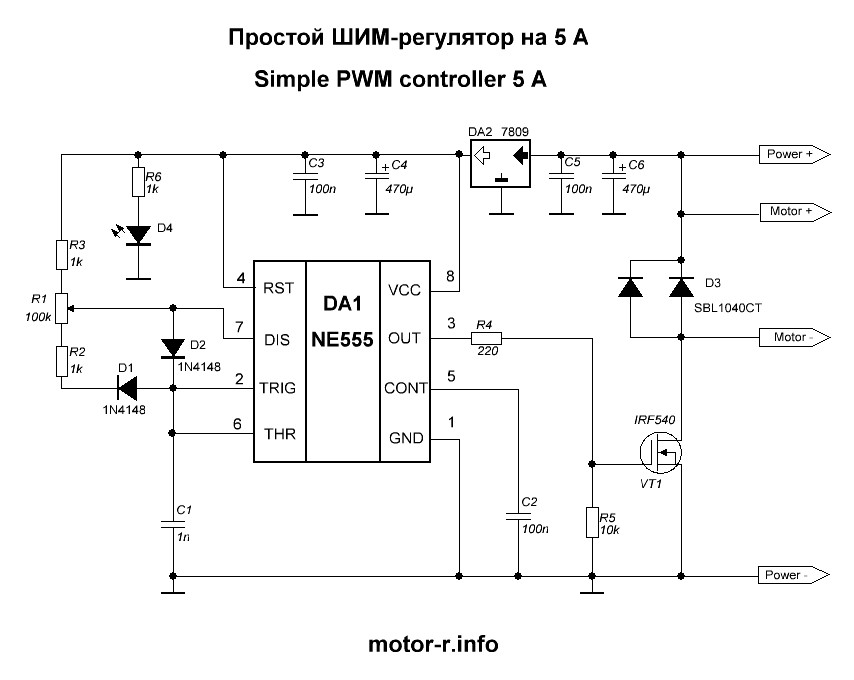 Рассмотрим первый ШИМ-регулятор на 5 ампер. Есть такая самая любимая микросхема всех радиолюбителей - это таймер NE555 ( или советский аналог КР1006ВИ). Вот на этой микросхеме и собран ШИМ-регулятор. Кроме таймера здесь я использую стабилизатор на 9 вольт LM7809 , мощный полевой транзистор с N-каналом IRF540, сдвоенный диод Шоттки, а также другие мелкие детали. Схема по которой собран этот регулятор всем известна и очень популярна.